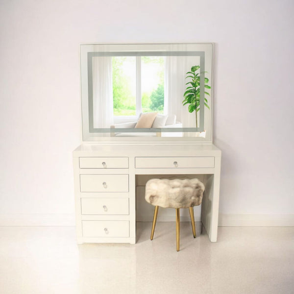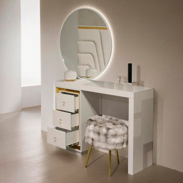 La fina estructura y el espejo con luz indirecta incorporadas de nuestro Vanity Jade lo convierten en una opción única, sus 3 cajones son perfectos para almacenar, decorar e iluminar...