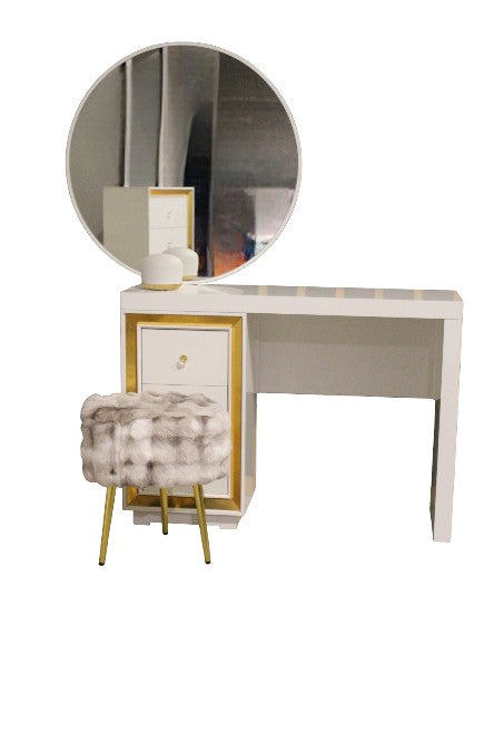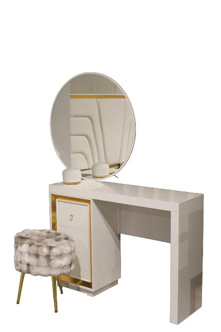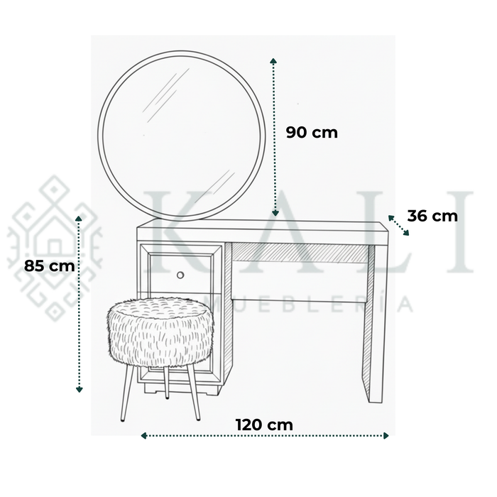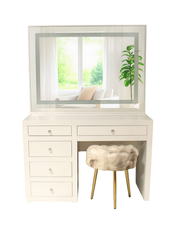 La fina estructura y el espejo con luz indirecta incorporadas de nuestro Vanity Jade lo convierten en una opción única, sus 3 cajones son perfectos para almacenar, decorar e iluminar con elegancia cualquier habitación. Este modelo cuenta con un taburete tapizado que encaja a la perfección para aprovechar al máximo el espacio disponible.