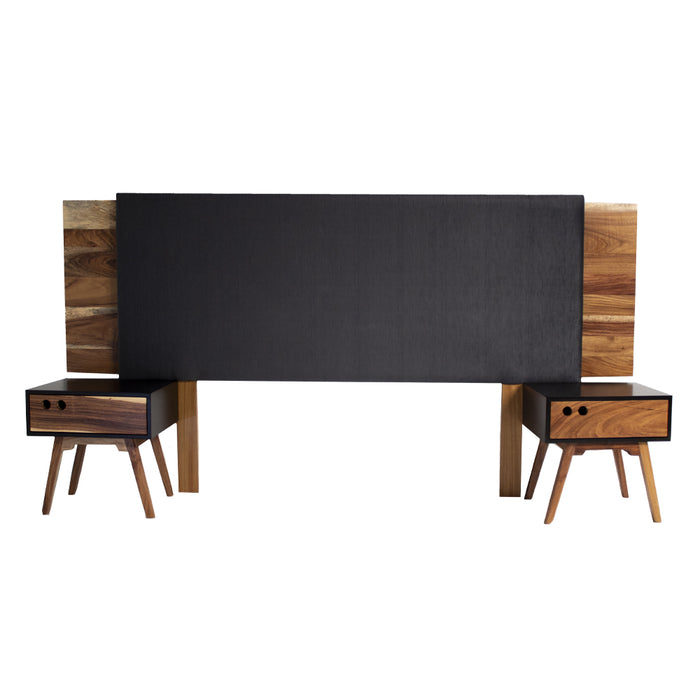Cabecera realizada en madera de Parota con acabado natural y tapizada en tela, burós fabricados en MDF grabado de 12 mm color gris, con puertas de cajones y patas realizadas en parota color natural. El color puede tener una ligera variación al mostrarse en la imagen.