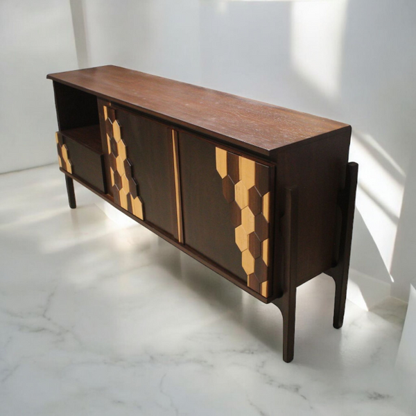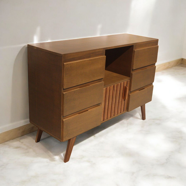 Este modelo es un mueble consola de diseño moderno, elaborado en madera con vetas naturales que aportan calidez y elegancia. Sus líneas geométricas y frentes inclinados le dan un estilo...