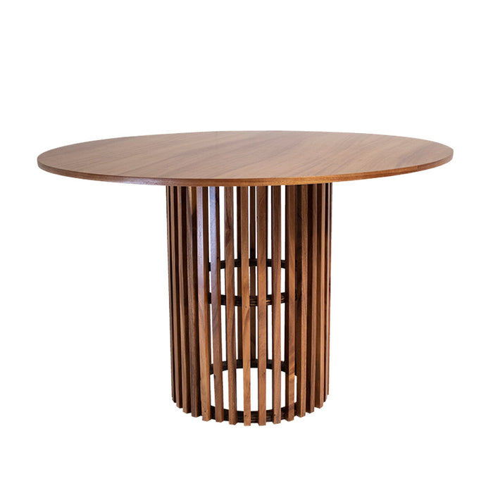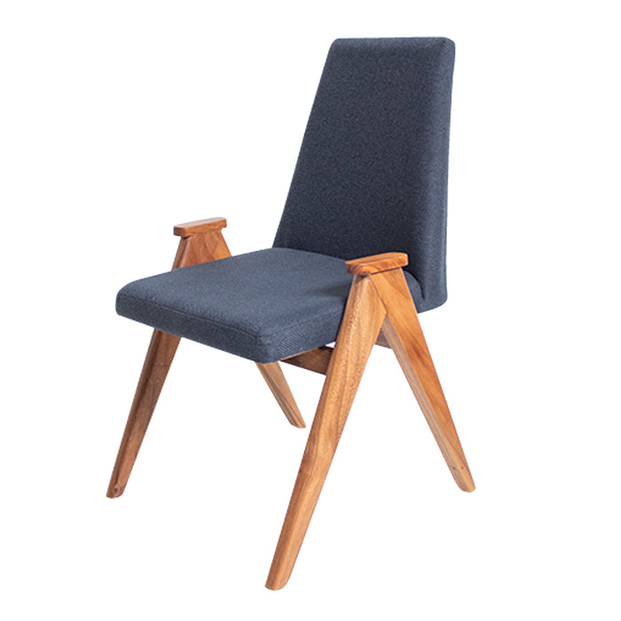 Cubierta, pedestal y sillas realizadas en madera de parota solida con acabado natural, sillas tapizadas en tela tapus azul. El color puede tener una ligera variación al mostrarse en la imagen.