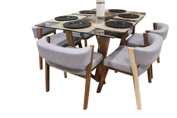 El Comedor Bogota destaca por su equilibrio entre naturalidad y elegancia. Su cubierta de cristal transparente de 9 mm permite apreciar la belleza de la base y sillas fabricadas en madera de parota, una especie apreciada por sus vetas marcadas y tonalidades cálidas. Esta combinación crea un conjunto luminoso y acogedor que armoniza con distintos estilos, desde espacios modernos hasta ambientes más tradicionales.