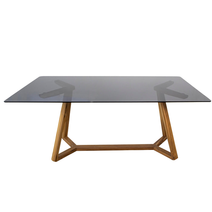Cubierta rectangular de cristal templado de 9mm tintado color negro con un pedestal realizada en madera de Teca con acabado natural. Silla de madera de Teca con acabado natural y tapizadas en color negro. El color puede tener una ligera variación al mostrarse en la imagen.