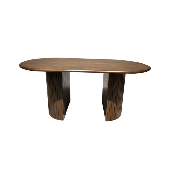 Mesa elaborada en madera de álamo, reconocida por su resistencia y delicadas vetas naturales. Su acabado en tono nogal realza la calidez de la madera, mientras que su cubierta ovalada aporta suavidad visual y un aire contemporáneo. Una pieza elegante y versátil, ideal para realzar espacios modernos o con un encanto natural.