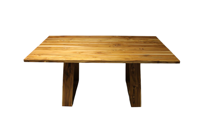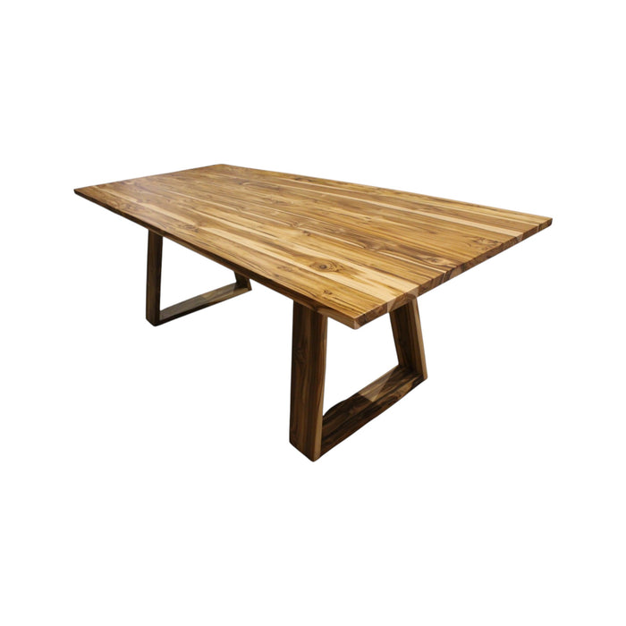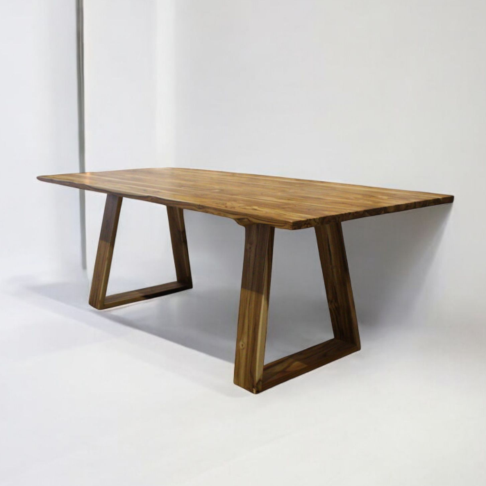 Mesa de madera de teca, reconocida por su durabilidad y vetas marcadas. Su diseño contemporáneo con cubierta rectangular y patas tipo “loop” ofrece estabilidad y estilo, ideal para ambientes modernos y rústicos.