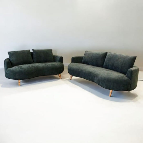 Este juego de sala está compuesto por dos piezas: un sofá de tres plazas y un sofá de dos plazas. Ambos comparten un diseño distintivo con líneas curvas y modernas,...