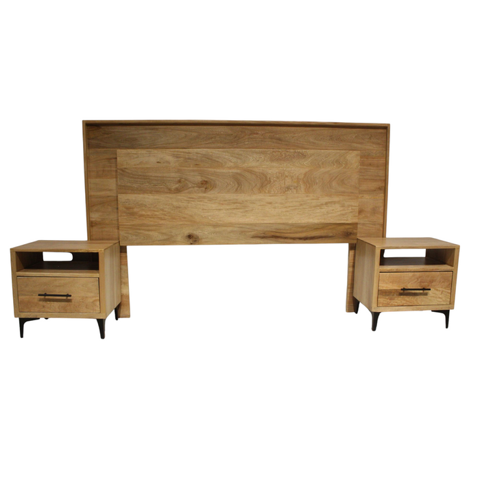 Sus burós integrados de estilo minimalista aportan funcionalidad sin restar protagonismo a la madera, creando un conjunto elegante, cálido y sofisticado que transforma cualquier recámara.