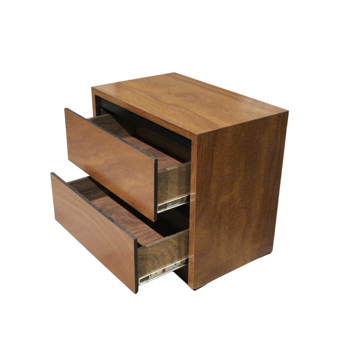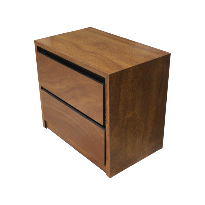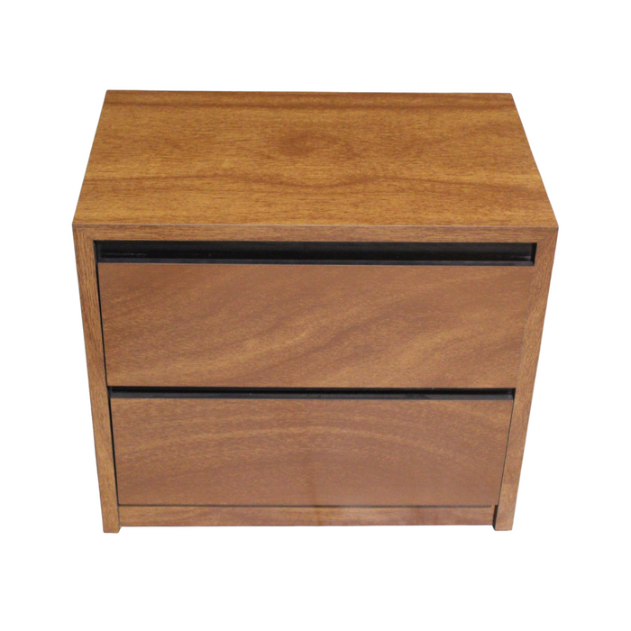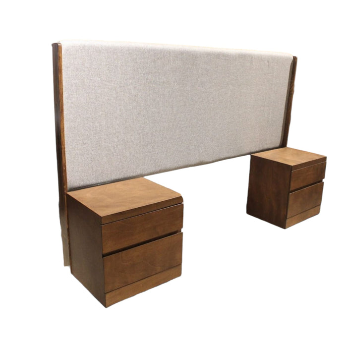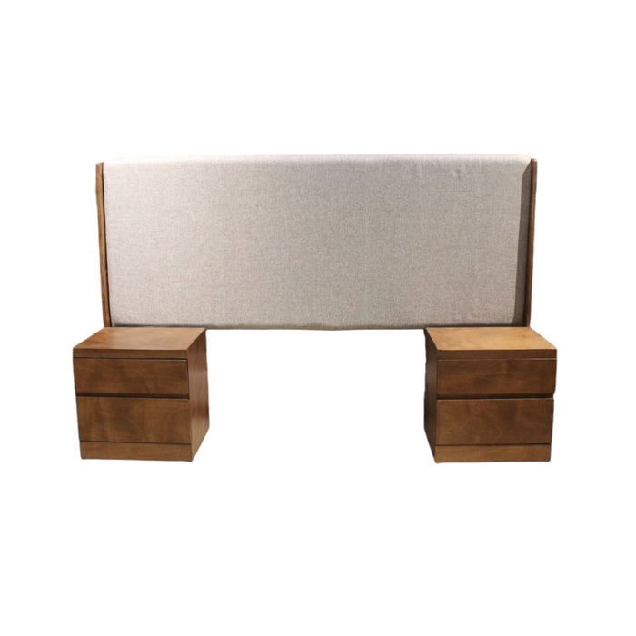 Conjunto fabricado en MDF de 12 mm de primera calidad enchapado en madera de okumé en color café claro y cabecera tapizada en tela oslo paraiso color beige. El color puede tener una ligera variación al mostrarse en la imagen.