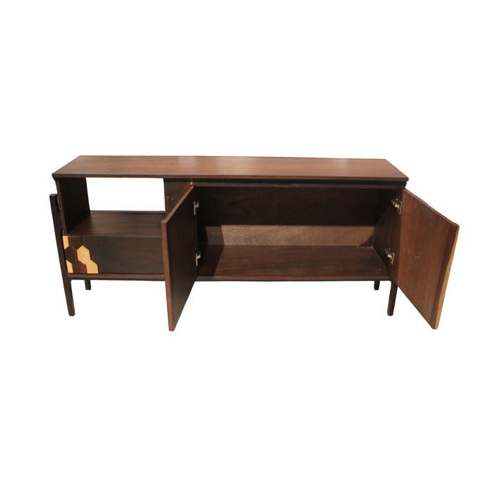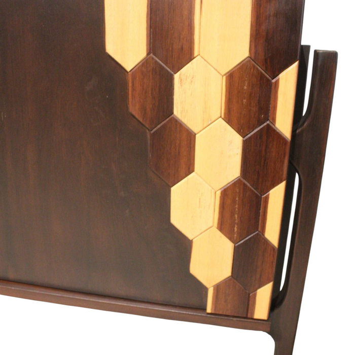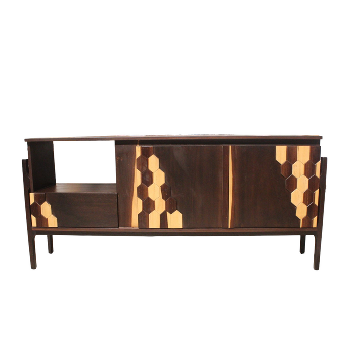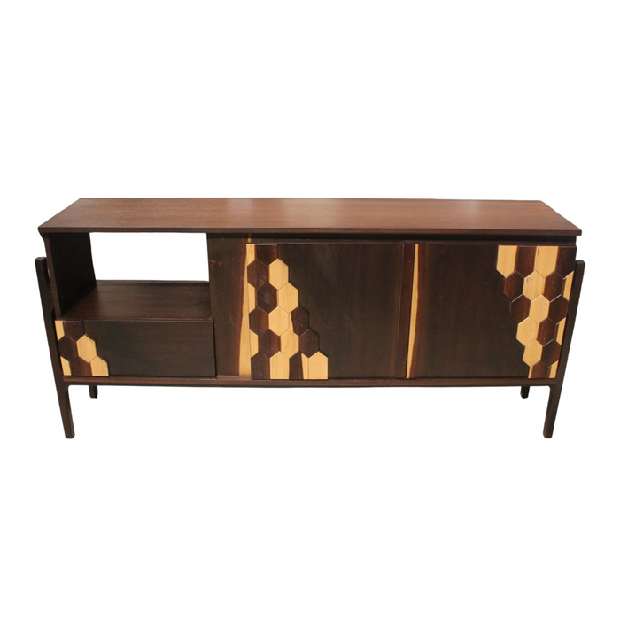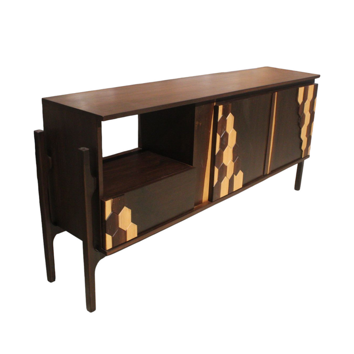 Nuestro aparador es la pieza ideal para quienes buscan un estilo moderno con un toque sofisticado. Elaborado en madera de encino y katalox, esta última reconocida por su dureza, resistencia y su hermoso tono oscuro con vetas profundas que aportan carácter y elegancia natural. Su diseño de líneas rectas y detalles geométricos realzan la pieza, mientras que su amplia superficie y espacios de almacenamiento lo hacen funcional y versátil, adaptándose fácilmente a salas, comedores o recibidores y a distintos estilos de decoración.