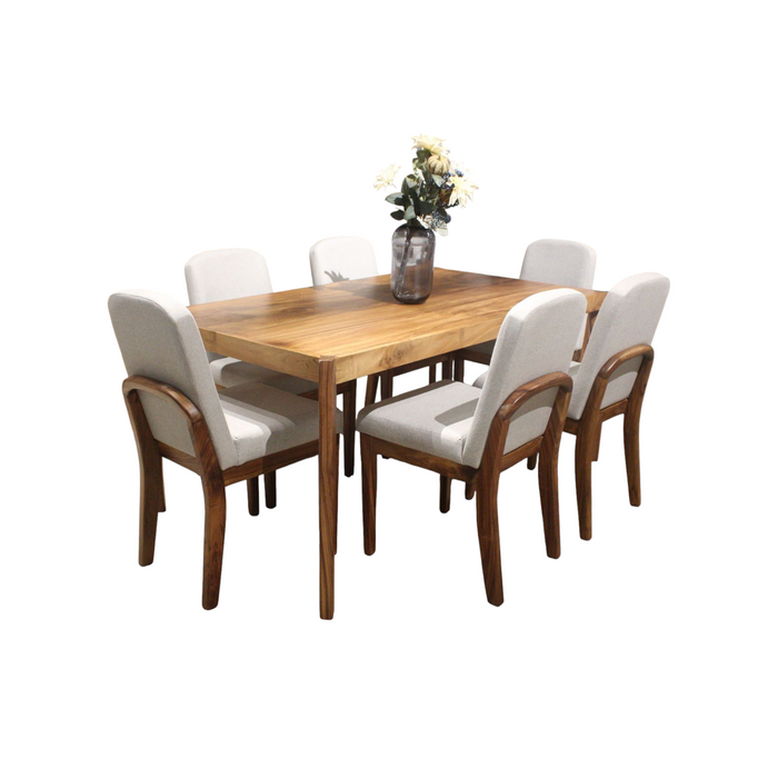 Mesa y sillas fabricadas en solida madera de parota con acabado natural y tapizadas en tela elite silver. El color puede tener una ligera variación al mostrarse en la imagen.