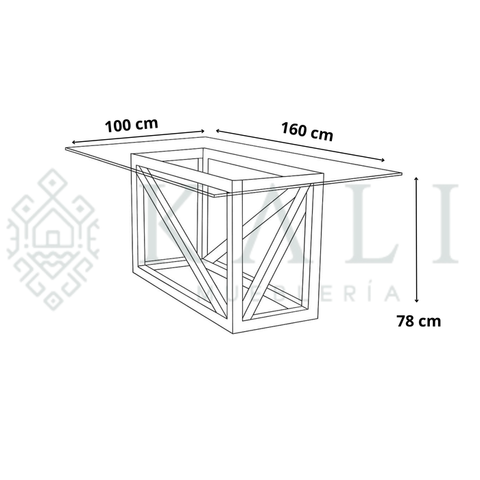 Cubierta rectangular de cristal, pedestal y sillas realizadas en madera de parota con acabado natural, sus sillas están tapizadas en tela tapus azul. El color puede tener una ligera variación al mostrarse en la imagen.