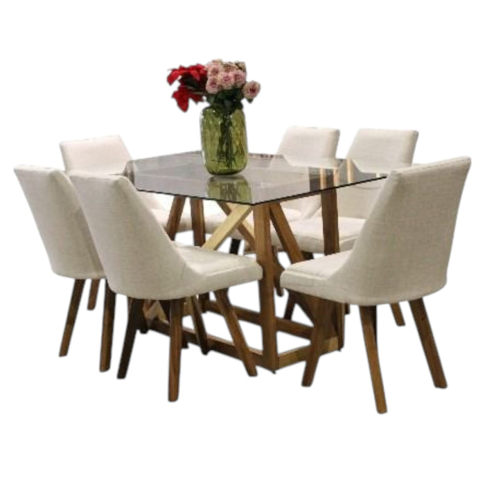 Nuestro comedor Noruega, cuenta con una cubierta rectangular de cristal que descansa sobre un hermoso pedestal realizado en sólida madera de parota. Es resistente y de buen gusto, la profundidad del color azul de sus sillas aporta calidez y carácter a tu espacio. Disfruta de todas tus comidas con todos tus seres queridos con este set para 6 personas.