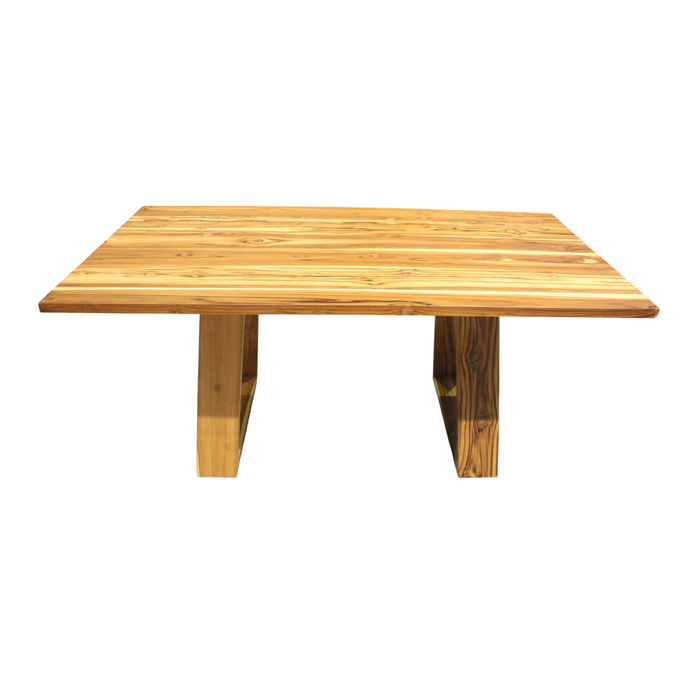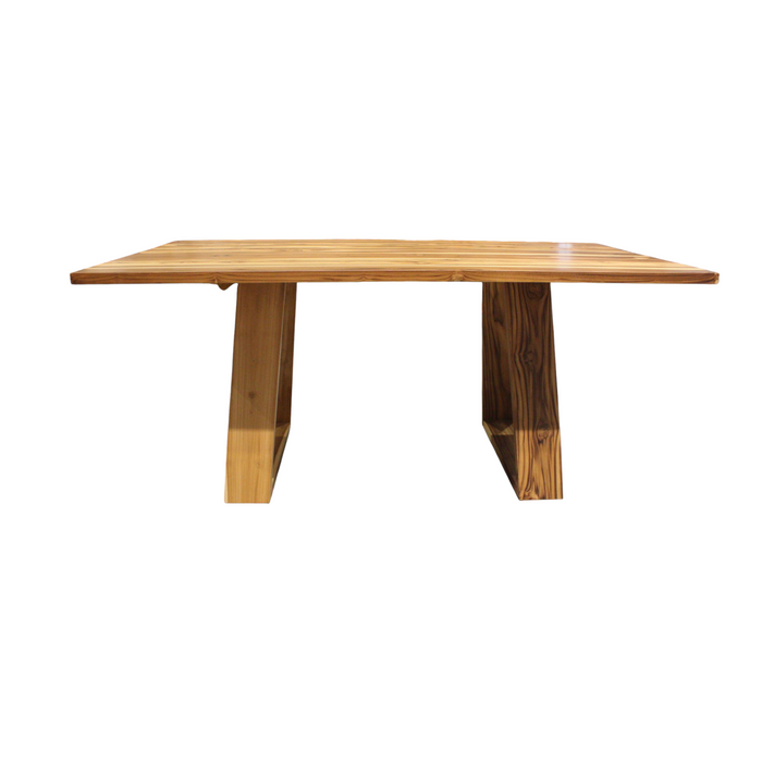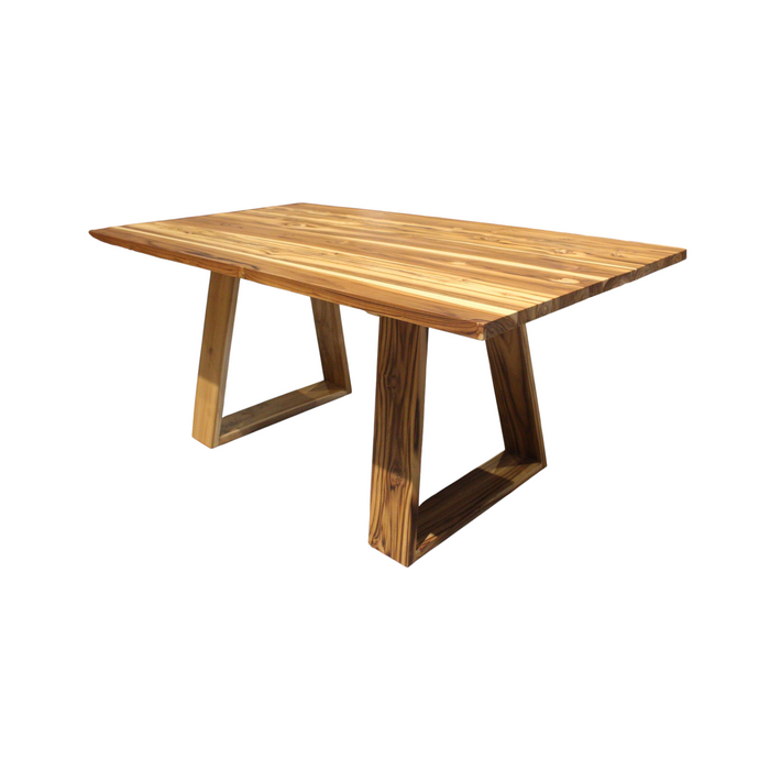 Mesa de madera de teca, reconocida por su durabilidad y vetas marcadas. Su diseño contemporáneo con cubierta rectangular y patas tipo “loop” ofrece estabilidad y estilo, ideal para ambientes modernos y rústicos.