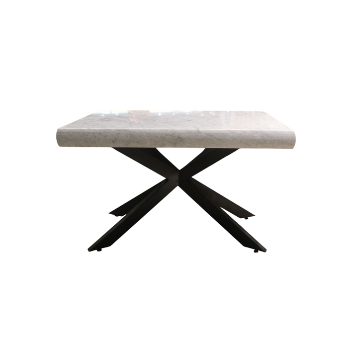 Hermosa mesa para cuatro personas elaborada en mármol Carrara blanco, reconocido por su belleza natural y sus finas vetas grises que le aportan un estilo único y atemporal. Su cubierta con acabado brillante brinda amplitud y luminosidad, mientras que su base de herrería añade firmeza y un contraste moderno que realza la decoración de tu hogar, creando un ambiente sofisticado y minimalista.
